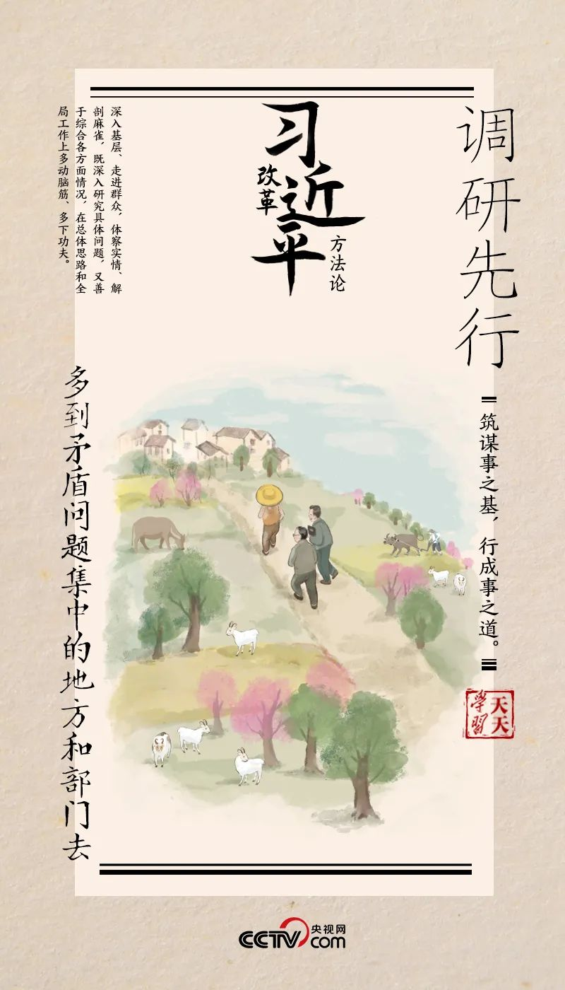 “调查研究是谋事之基、成事之道。没有调查,就没有发言权,更没有决策权。” 2013年,习近平总书记在武汉召开部分省市负责人座谈会时指出,研究、思考、确定全面深化改革的思路和重大举措,刻舟求剑不行,闭门造车不行,异想天开更不行,必须进行全面深入的调查研究。 《干在实处 走在前列》一书记录了习近平对调查研究的深刻思考:“人的正确思想不是从天上掉下来的,不是头脑里固有的,而是从实践中来的。” 这实践,指的就是调查研究。 1983年夏收后的一天,时任河北正定县委书记的习近平拉上县政府办公室的工作人员说:“走,我们去找人聊聊。” 两个人骑着自行车来到县城附近的三角村村外,十来个村民正在田间锄草、间苗。看到地头还放着几把农具,习近平撸起袖子,拿起锄头跟着大家熟练地干起来。 趁着歇晌的时候,习近平跟大家你一言我一语地唠家常、聊生产。谈到正定县未来发展,村民畅所欲言:“三角村离县城很近,种点儿经济作物供给县城,不是更好吗?” 习近平仔细听完村民意见后说:“回去就认真研究。”