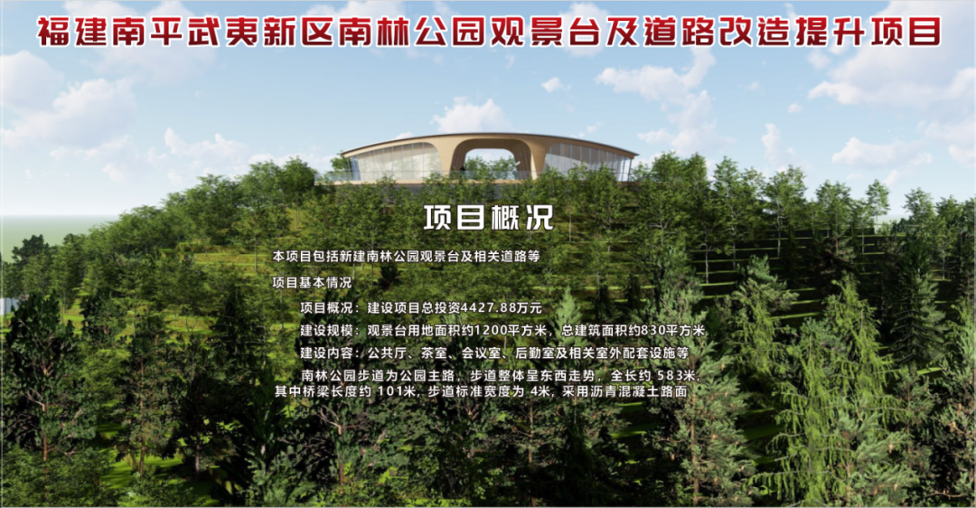1月13日上午,福建南平武夷新区南林公园观景台及道路改造提升项目在南林公园举办开工仪式,该项目的代业主单位为福建省闽北水利水电工程公司。参加本次开工仪式的有:南平市武夷新区管理委员会、南平市城市公园服务中心、羞羞漫画 、南平武夷新区城市发展集团有限公司、福建省闽北水利水电工程公司等主要单位及领导。 南林公园观景台及道路改造提升项目本项目包括新建南林公园观景台及相关道路等。建设项目总投资4427.88万元。建设规模为观景台用地面积约1200平方米,总建筑面积约830平方米,建设内容包含公共厅、茶室、会议室、后勤室及相关室外配套设施等;南林公园步道为公园主路,步道整体呈东西走势,全长约 583m,其中桥梁长度约 101m,步道标准宽度为 4m,采用沥青混凝土路面。