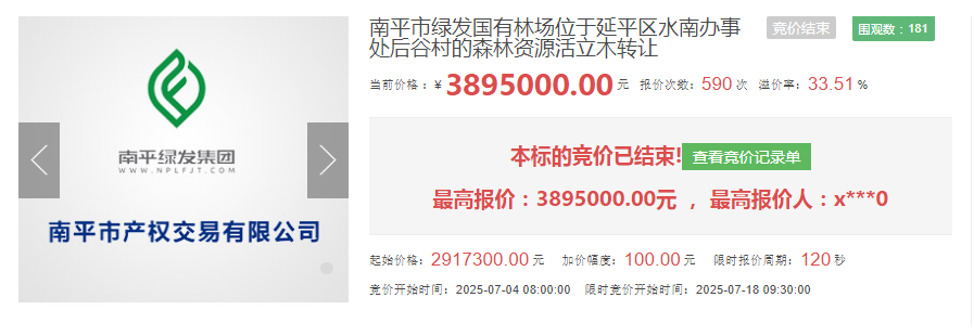 鉴于林木资源项目的特殊性与复杂性,产权公司充分发挥专业平台优势,严格遵循相关法律法规和交易规则,确保了每一个环节的公正、公平、公开。通过广泛的信息发布和精准的市场推广,吸引了大量潜在投资者的关注,征集到6家意向受让方,有效提升了交易的活跃度和竞争性。 此次林木资源高溢价成交是南平市产权交易有限公司服务林木资源交易的具体举措,也是破除区域壁垒,服务全市经济的一成功实践。下一步南平市产权交易有限公司将立足平台优势,激发多要素交易活动,深入探索和创新资源交易模式,推动“资源”变“资金”。 内容来源|南平市产权交易有限公司 初审初校|叶文龙 复审复校|徐 志 终审终校|涂洪彬 |