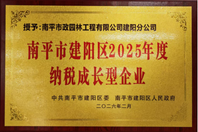 南平市政园林工程有限公司: 建阳区2025年度纳税成长型企业 市政园林公司深耕市政园林领域,凭借卓越的工程品质和良好的市场信誉,业务发展迅速,企业效益与纳税贡献同步实现显著增长。